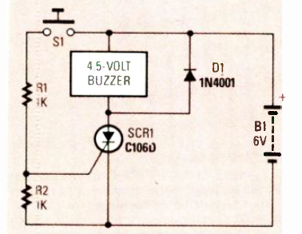 Este circuito se encontró en un Radio Electronics de septiembre de 1987. La corriente que pasa por el interruptor es muy baja y el circuito es para un zumbador que tiene capacidades de autointerrupción.