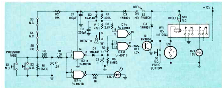 Encontramos este circuito en la edición de mayo de 1990 de la revista Radio Electronics. El circuito está alimentado de acuerdo con el relé utilizado y utiliza sensores normalmente abiertos y normalmente cerrados.