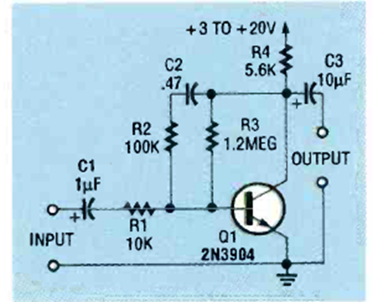 Utilizando un transistor de propósito general, este amplificador de CA fue encontrado en la edición de noviembre de 1993 de la revista Electronics Now.