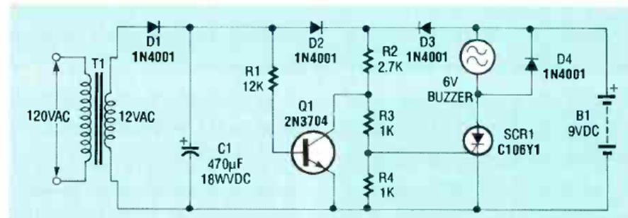 Este circuito activa una alarma cuando se corta el suministro de energía a la red eléctrica. El circuito fue encontrado en la edición de julio de 1990 de la revista Radio Electronics.