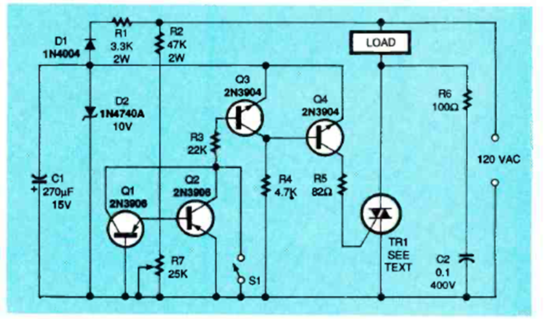 Este circuito es una modificación del anterior, también encontrado en la revista Electronics Now de julio de 1995. El triac debe ser controlado por potencia.