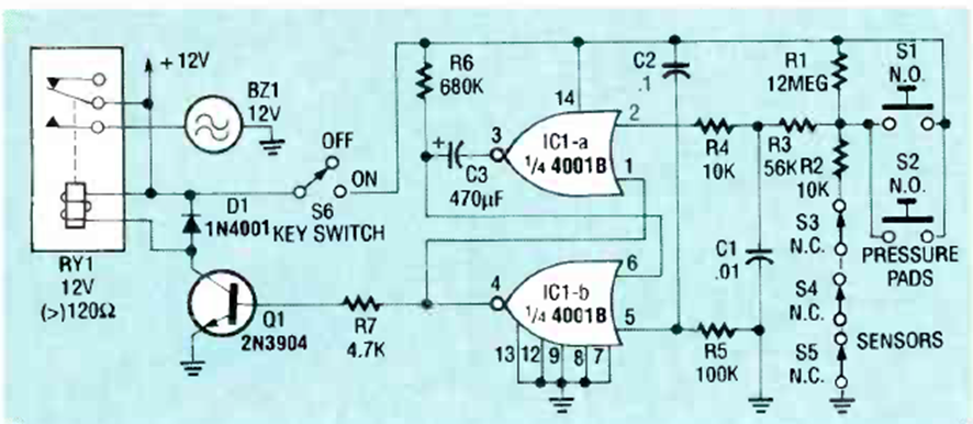 Este circuito fue encontrado en la revista Radio Electronics de mayo de 1990. Los tiempos dependen de los capacitores y la tensión de alimentación depende del relé utilizado.