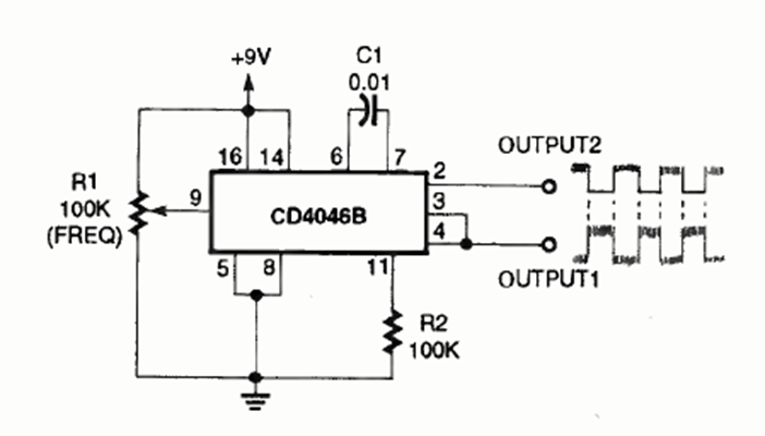 Este circuito fue encontrado en la edición de agosto de 1994 de la revista Electronics Now. El 4046 es poco común en estos días y el rango de frecuencia está dado por C1.