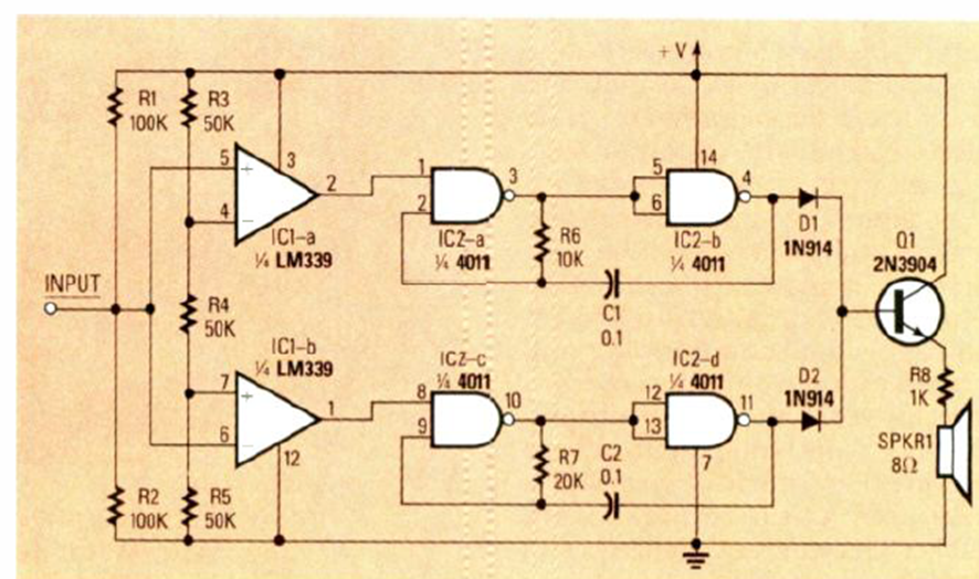 Este circuito se encontró en la edición de agosto de 1987 de la revista Radio Electronics. Se implementó con lógica CMOS y se puede utilizar tanto en circuitos TTL como CMOS. La alimentación proviene del propio circuito bajo prueba.