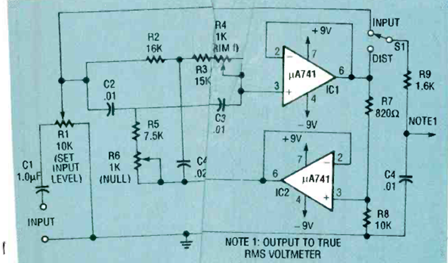 Encontrado en la revista Electronics Now de agosto de 1993, este circuito emplea dos fuentes de alimentación simétricas operativas 741. La salida se aplica a un circuito de medición RMS real.