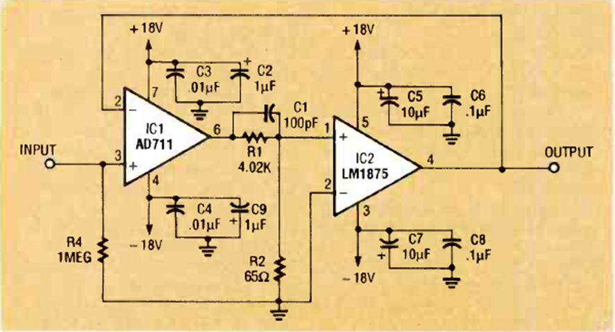 A diferencia del circuito anterior que es de tipo inversor, éste no es inversor. El circuito requiere una fuente de alimentación simétrica y se encontró en la revista Radio Electronics de noviembre de 1992.