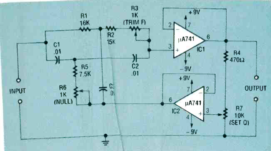 Este filtro, que rechaza frecuencias cercanas a 1 kHz, se encontró en la revista Electronics Now de agosto de 1993. El ajuste fino se realiza en R3 y la fuente debe ser simétrica.