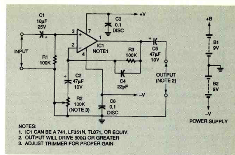 Este circuito fue encontrado en la edición de agosto de 1996 de la revista Electronics Now. El circuito se basa en un circuito operacional cuyo tipo determina las ganancias y límites para la frecuencia.
