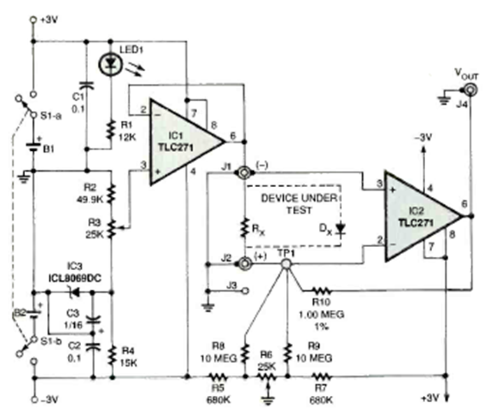 Con este circuito es posible agregar una escala de conductancia a un multímetro común. El circuito fue encontrado en la edición de febrero de 1997 de la revista Electronics Now.