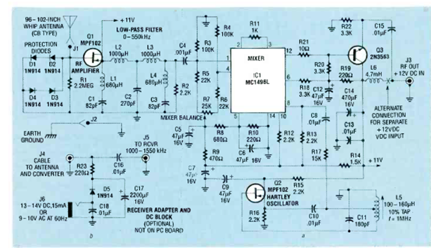 Con este circuito de la revista Radio Electronics de septiembre de 1989, es posible recibir señales de banda VLF en una radio común, como las señales emitidas por el receptor anterior.