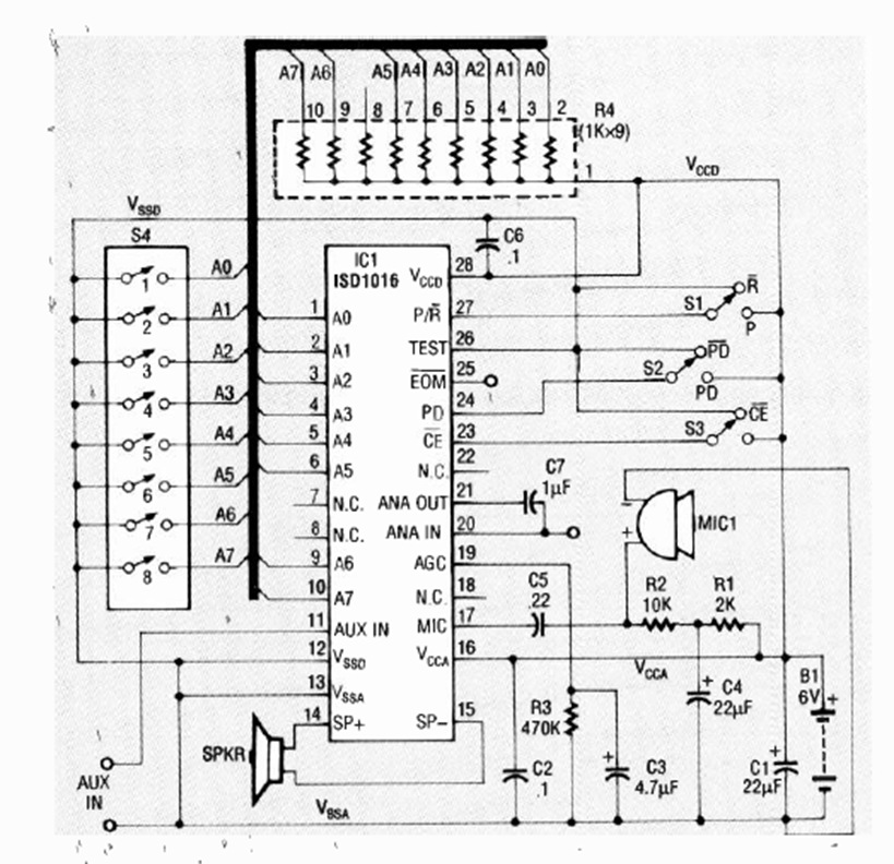 Este circuito de grabación de voz de 16 segundos apareció en un circuito de contestador telefónico en la edición de marzo de 1992 de la revista Radio Electronics.