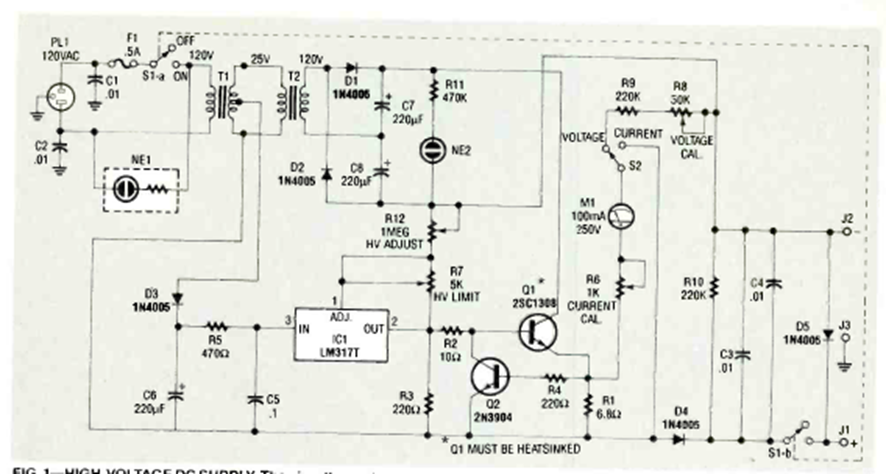 Este circuito de alimentación se obtuvo de la edición de febrero de 1993 de la revista Radio Electronics. El circuito integrado y los transistores de potencia deben contar con disipadores térmicos.