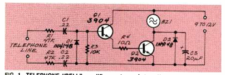 Este circuito de zumbador adicional se encontró en la edición de febrero de 1994 de la revista Electronics Now. Los transistores son comunes y el circuito es para líneas analógicas.
