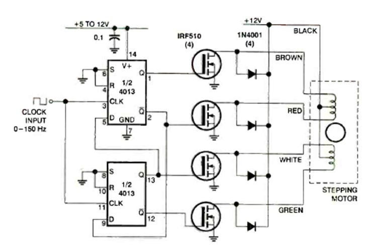 Este controlador de motor paso a paso de 12 V se encontró en la edición de agosto de 1996 de la revista Electronics Now. El circuito tiene una entrada de pulso y los MOSFET pueden ser de prácticamente cualquier tipo.