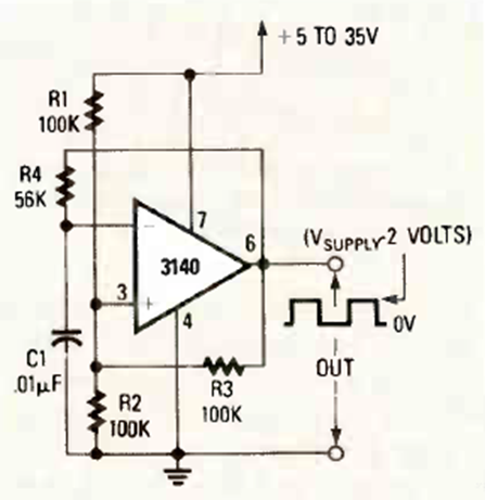 Con este oscilador se puede obtener una frecuencia de hasta unos pocos kilohertz. La frecuencia viene dada por C1 y puede modificarse. La señal de salida es rectangular.