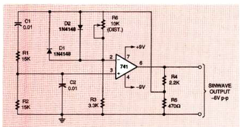 Este circuito para señales sinusoidales de 1 kHz utiliza un circuito operativo común y está alimentado por una fuente simétrica. El circuito es de la revista Electronics Now, diciembre de 1995.
