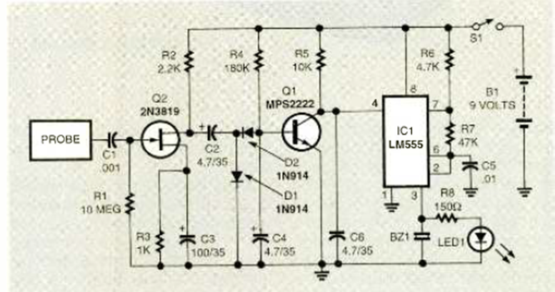 Este circuito consta de un sensor electrostático que puede comprobar si un cable está energizado simplemente acercándose a él. El circuito es de Electronics Now de diciembre de 1998.