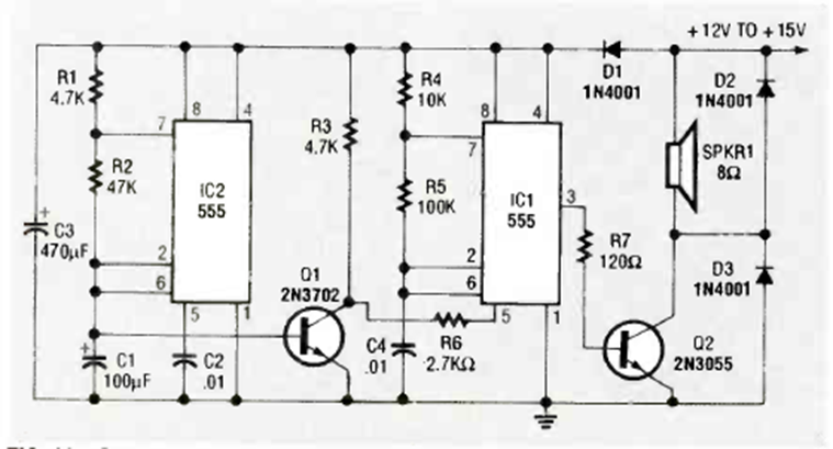 Esta es una de las muchas configuraciones de sirena posibles para el circuito integrado 555. La encontramos en la revista Radio Electronics de octubre de 1992. Tiene una etapa de potencia.