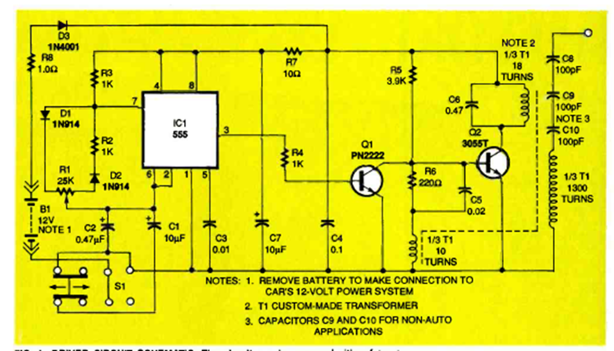 El propósito original de este circuito es alimentar lámparas de neón utilizadas en la decoración de automóviles. El circuito es de la revista Electronics Now y utiliza un transformador especial.
