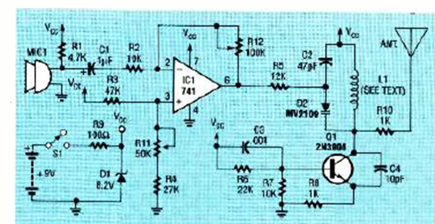 Diseñado para funcionar con una videocámara, este pequeño transmisor se encontró en la edición de febrero de 1993 de la revista Radio Electronics. El micrófono es electret.