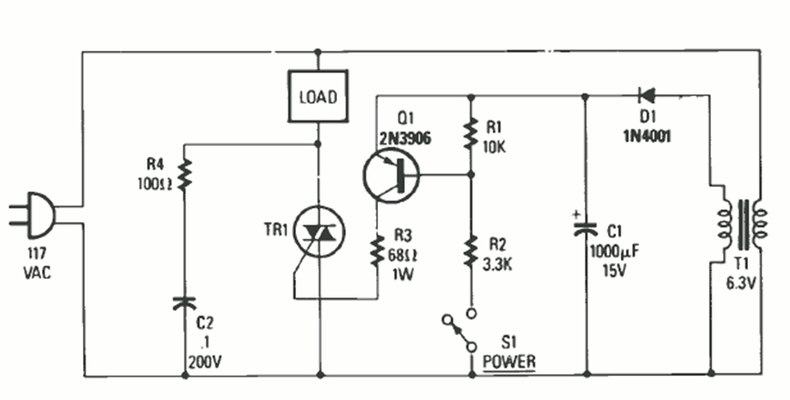 La potencia máxima de la carga controlada depende del triac utilizado. El circuito es de un Radio Electronics de octubre de 1987. El transformador es un transformador de baja corriente con 100 mA o más de corriente.