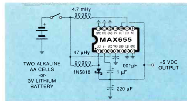 Esta fuente de alimentación de micro alimentada por batería se mostró en la revista Radio Electronics en 1991. La corriente máxima es de 170 mA y el circuito integrado es el MAX655 de Maxim.