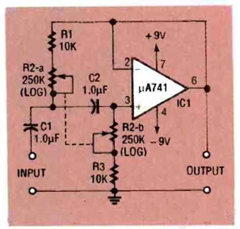 Este filtro de paso alto variable cubre el rango de 23 Hz a 700 Hz con los componentes utilizados. El circuito es de Electronics Now de agosto de 1993. La fuente debe ser simétrica.