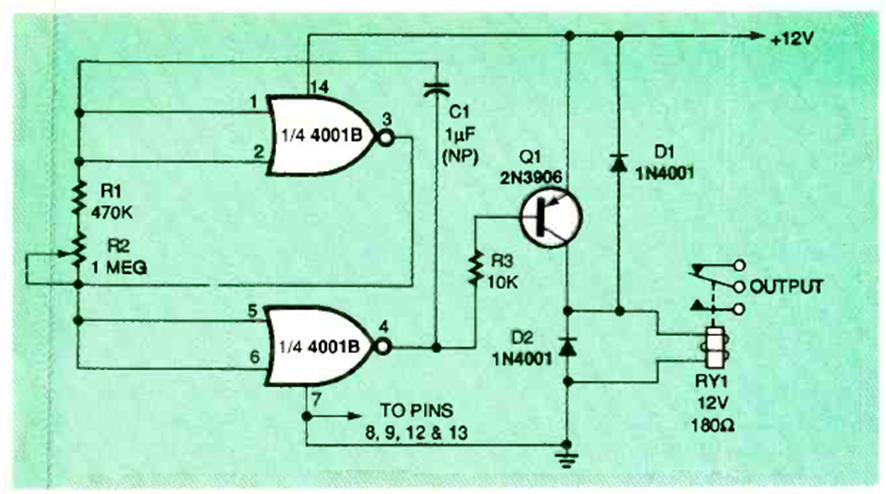 Este oscilador con CMOS 4001 enciende y apaga alternativamente el relé en los momentos establecidos por R2. El circuito es de una revista Electronics Now de junio de 1995.