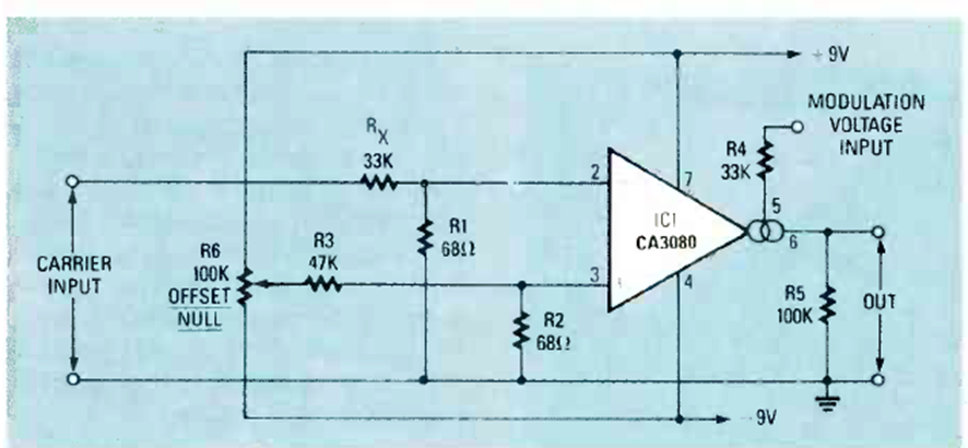 Este circuito modulador de 2 cuadrantes se encontró en la revista Radio Electronics de mayo de 1988. El CA3080 es un amplificador operacional OTA.