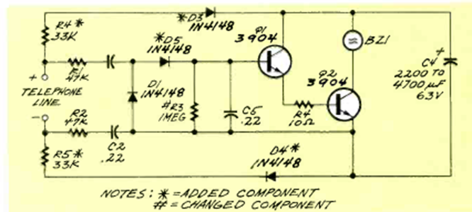 Para líneas analógicas, este circuito se encontró en la edición de agosto de 1994 de la revista Electronics Now. Los transistores son transistores comunes de propósito general.