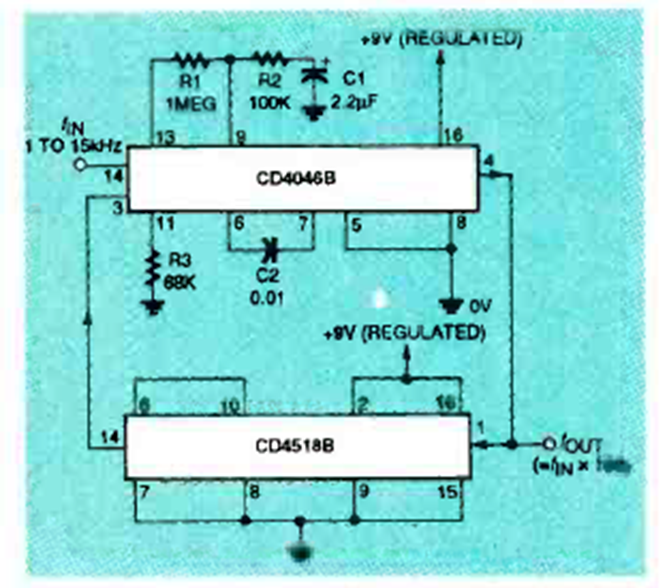 Este circuito multiplica la frecuencia de una señal por 100. El circuito fue encontrado en la edición de octubre de 1994 de la revista Electronics Now. El PLL no funciona por encima de aproximadamente una docena de megahertz.