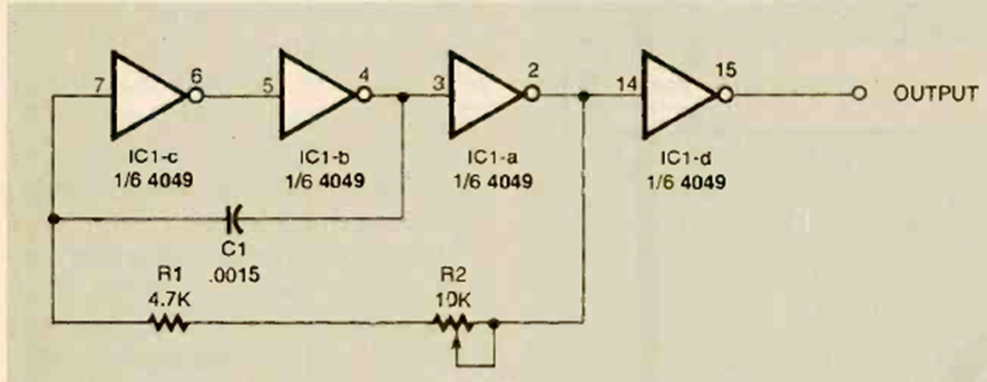 Este circuito fue encontrado en la edición de julio de 1998 de la revista Electronis Now. Es una versión tradicional con puerta del 4049 y tiene su frecuencia controlada por R2.