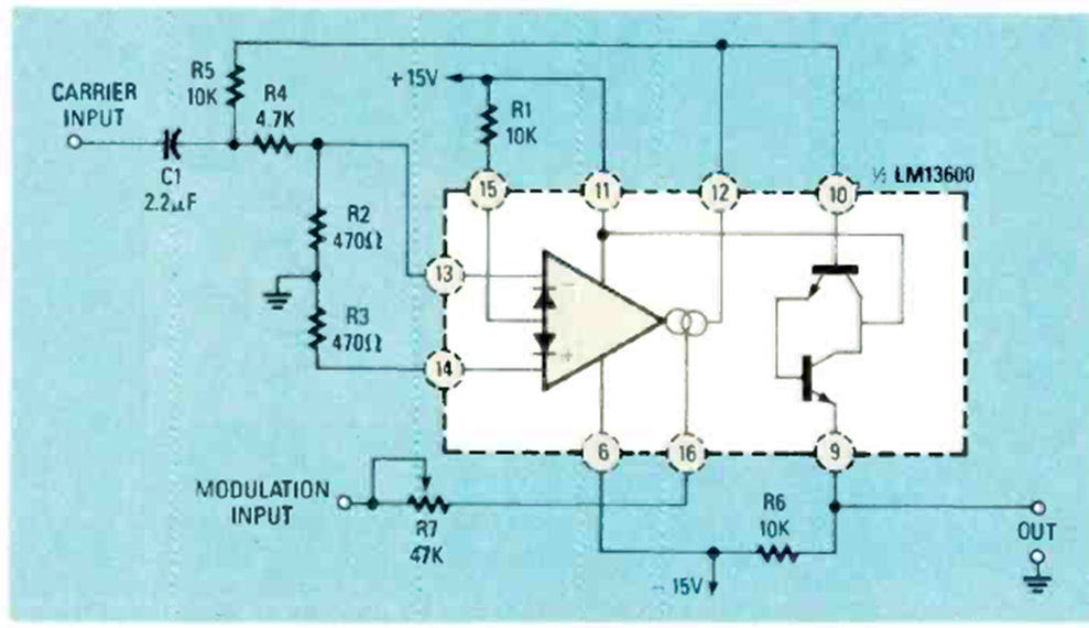 Este circuito es un multiplicador de cuatro cuadrantes que utiliza un LM3900. El circuito fue encontrado en la edición de julio de 1988 de la revista Radio Electronics.