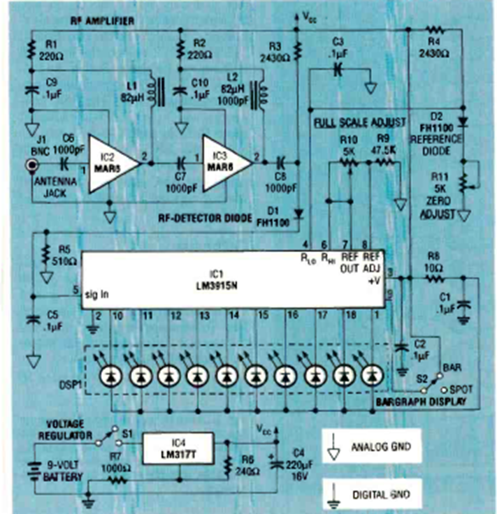 Este interesante sensor para señales de RF fue encontrado en un artículo de la edición de junio de 1989 de la revista Radio Electronics. Es un medidor de intensidad de campo con un indicador de barra gráfica LED.