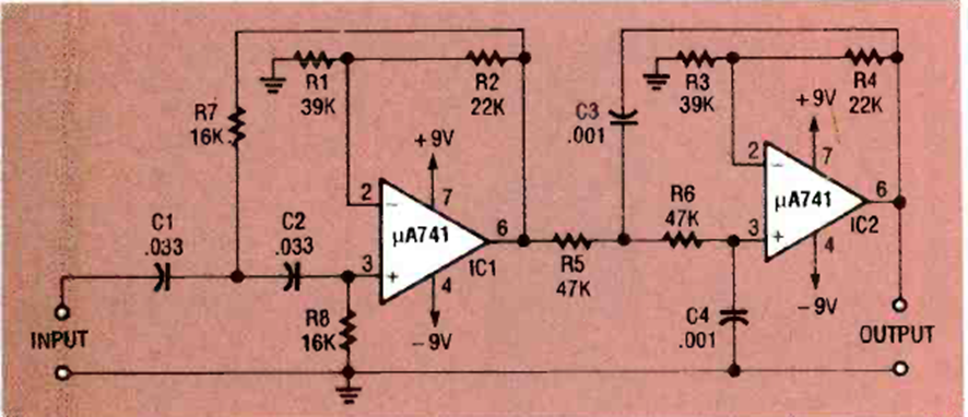 Este filtro con operacional 741 permite el paso del rango de frecuencia entre 300 Hz y 3400 Hz. Este rango se puede modificar modificando los componentes. El circuito es de Electronics Now de agosto de 1993.