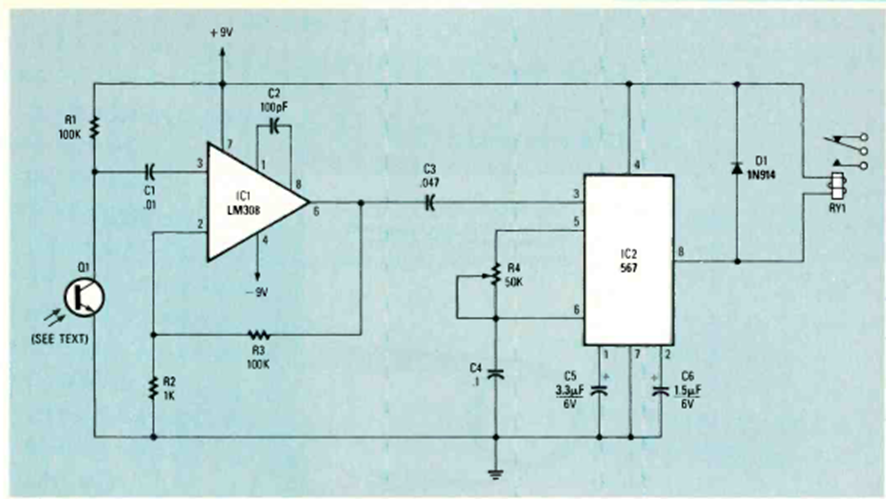 Este es el circuito receptor del control remoto anterior publicado en la misma revista Radio Electronics de noviembre de 1987. El sensor es un fototransistor ordinario.