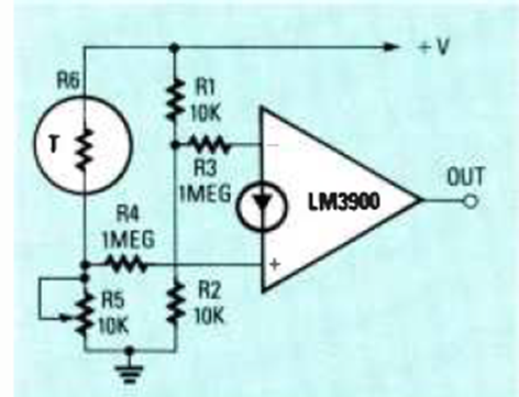 En la figura tenemos la forma de implementar un sensor de sobretemperatura con el amplificador Norton LM3900. El sensor es un termistor y R5 tiene un valor según este componente.