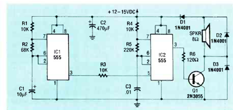 Encontramos este circuito de alarma en una revista de Radio Electronics de julio de 1990. El transistor de potencia debe estar equipado con un disipador de calor.