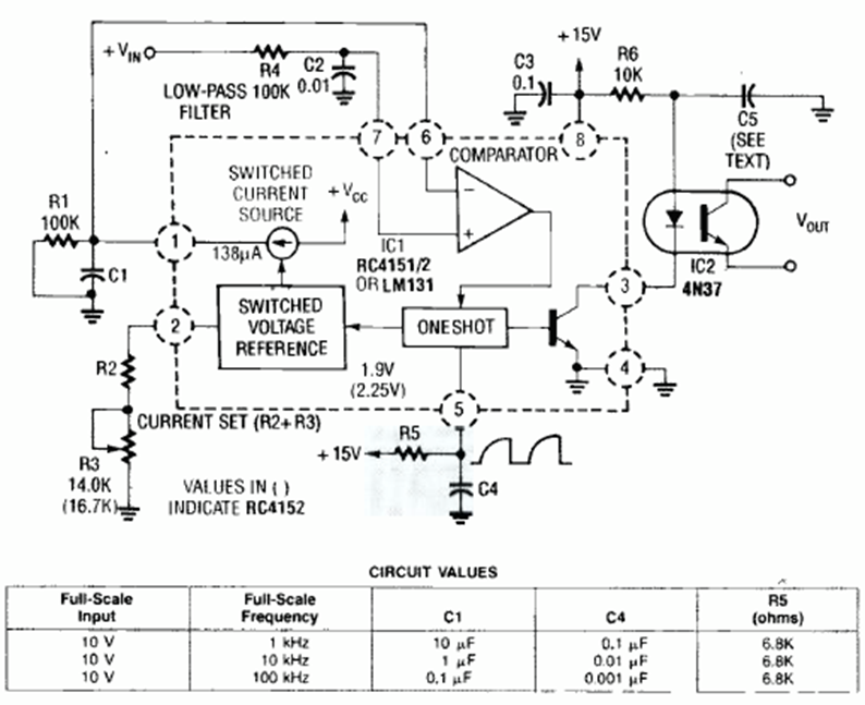 Encontramos este circuito en la edición de junio de 1991 de la revista Radio Electronics. El circuito integrado todavía está disponible. La tabla da los valores de los componentes.