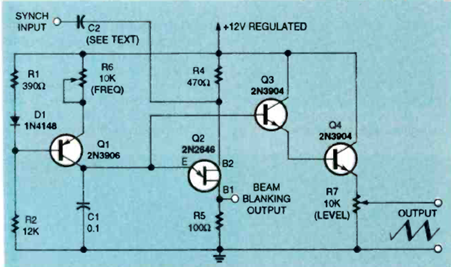 Este circuito, basado en un transistor unijuntura, se descubrió en la edición de enero de 1994 de la revista Electronics Now. El rango de frecuencia depende de C1, que puede modificarse.