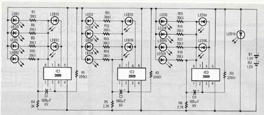Esta alegoría parpadeante con 555 circuitos integrados fue encontrada en la revista Radui Electronics Experimenter de 1989. Es un circuito sencillo de montar.