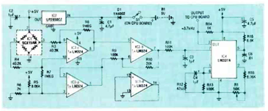 Esta es la parte analógica del circuito anterior con el sensor de presión para el altímetro. El circuito es de una Radio Electronics de octubre de 1990.