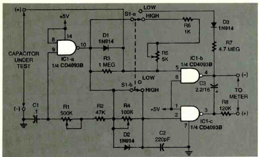 Este circuito fue diseñado originalmente para medir capacitancia con un ICL7107, pero se puede utilizar con otros módulos digitales. El circuito es de una revista Electronics Now de noviembre de 1996.