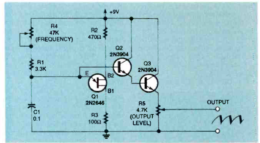 Utilizando un transistor unijuntura y dos transistores bipolares, este circuito genera una señal de 25 Hz a 3 kHz. El circuito es de una edición de enero de 1994 de la revista Electronics Now.