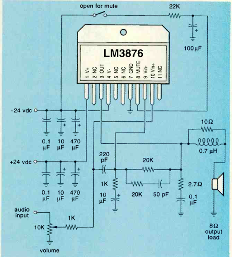 Este amplificador de audio híbrido de National Semiconductor se encontró en la edición de junio de 1994 de la revista Electronics Now. Se alimenta a 24 V.