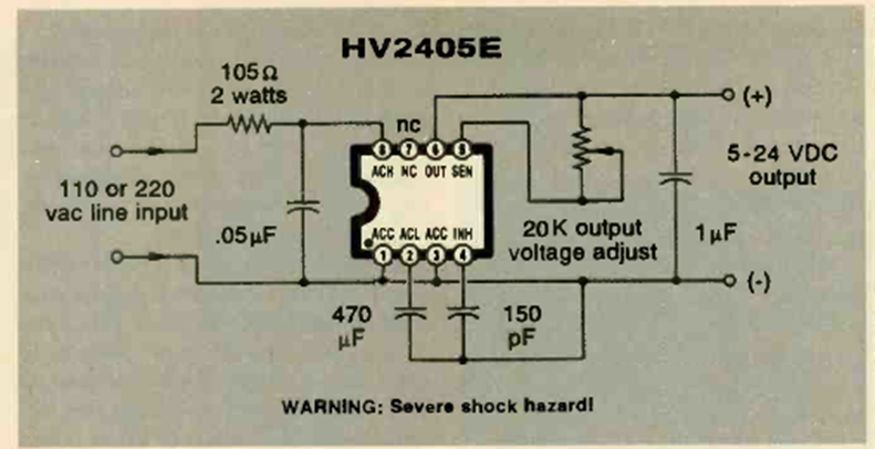 El circuito integrado HV2405E es poco común hoy en día. Este circuito fue encontrado en la edición de agosto de 1998 de la revista Electronics Now. La corriente es de unas pocas decenas de miliamperies.