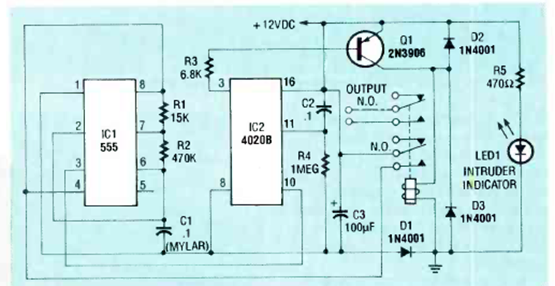 Este circuito es adecuado para alarmas, activando un relé después de un tiempo determinado. El circuito es de una Radio Electronics de julio de 1990.