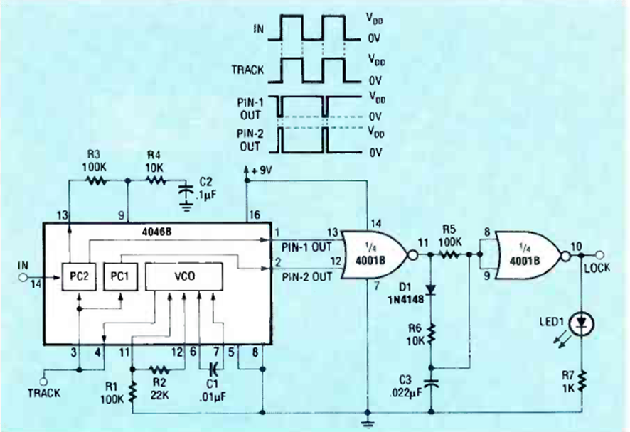 Utilizando un PLL 4046 este circuito reconoce un tono de 1,6 a 1,8 kHz, activando un LED de salida. El circuito es de una Radio Electronics de diciembre de 1989.