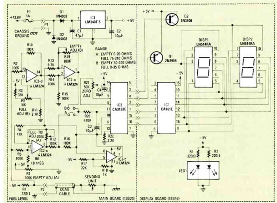 Este circuito, basado en el CA3161 y el CA3162, se encontró en la revista Radio Electronics de julio de 1990. El circuito tiene solo dos dígitos.