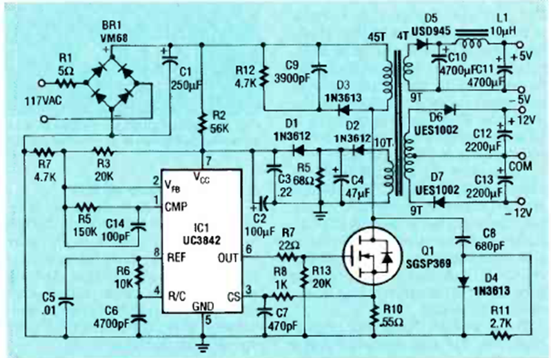 Esta fuente de alimentación conmutada múltiple se encontró en la revista Radio Electronic de abril de 1991. El MOSFET debe estar equipado con un disipador de calor.